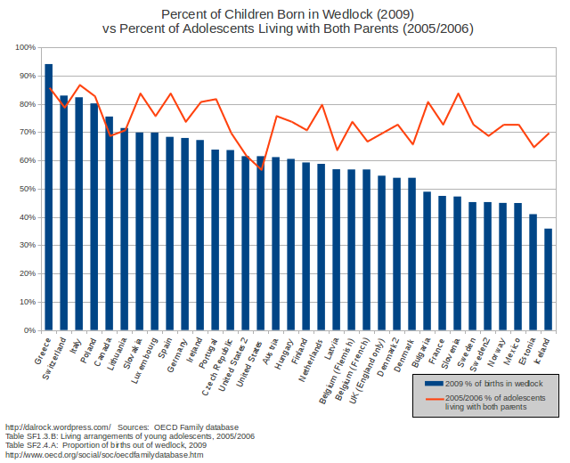 This trend also continues for marriage rates in general. While the developed world in general has seen falling marriage rates, the United States has more positive trends than Europe. Those damn immigrants getting married, padding our stats!